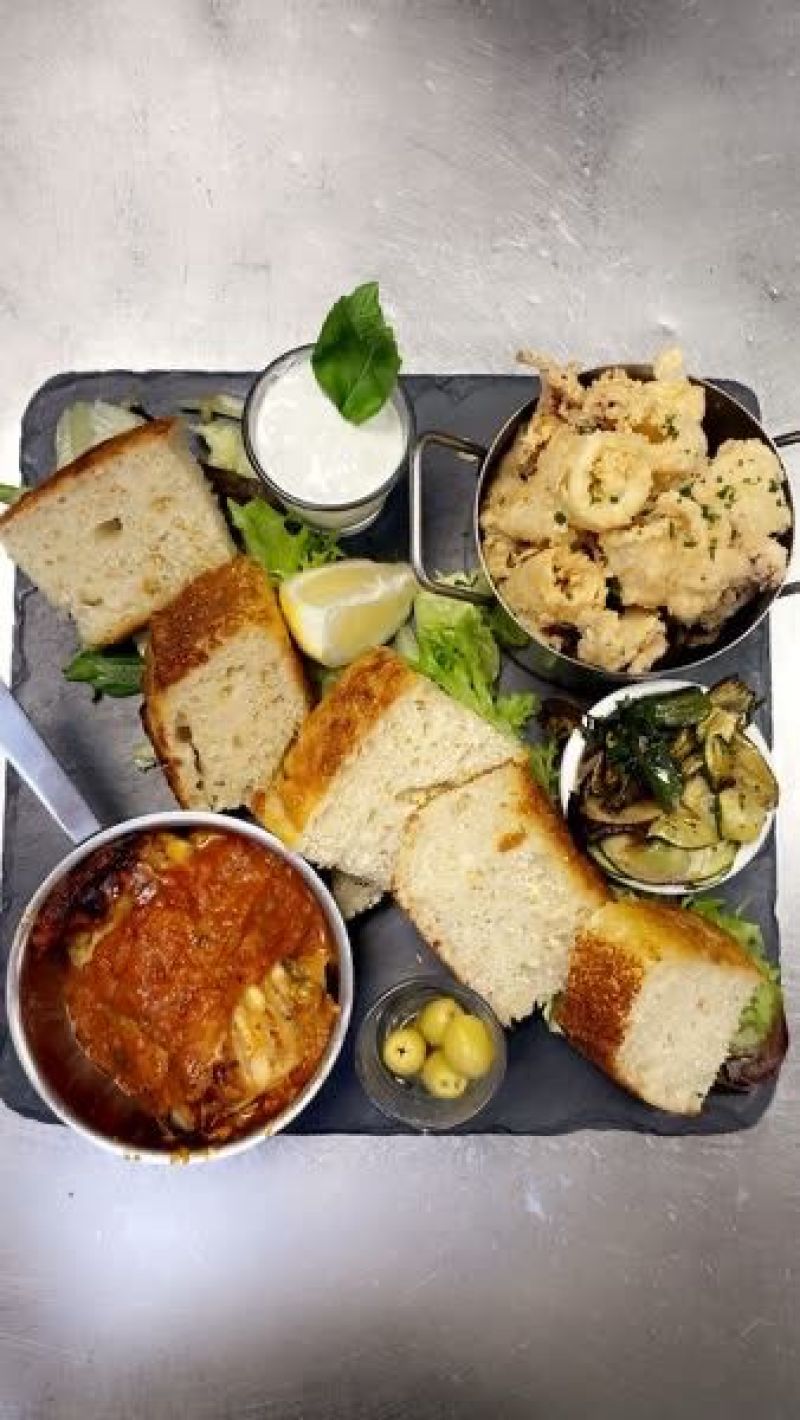 A partager ou en solo, Aubergines parmesane, stracciatella, légumes grillés, calamars frits, focaccia, olives